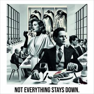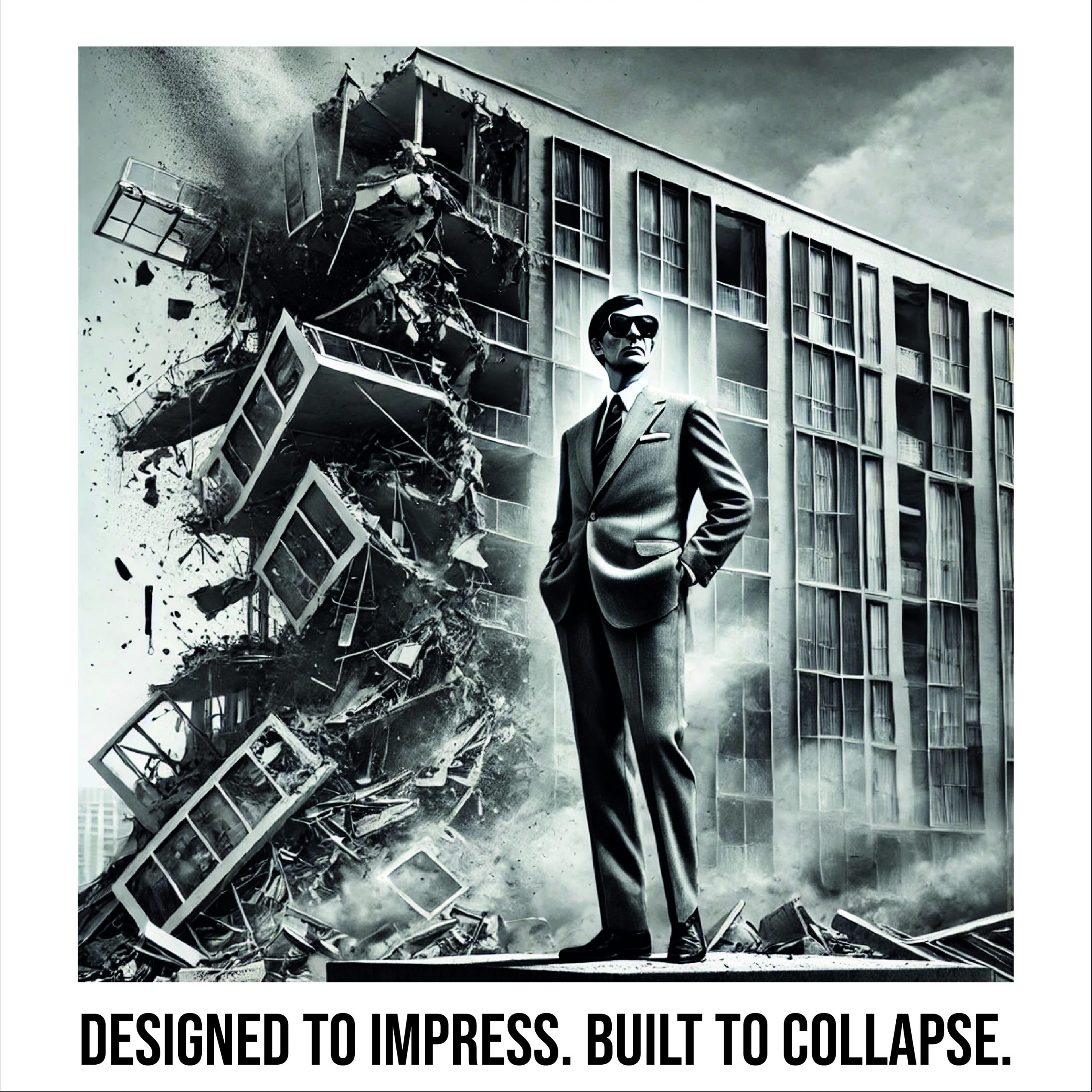 Name: DESIGNED TO IMPRESS. BUILT TO COLLAPSE. Year: 2024 Medium: Digital Series: Illustrated Punchlines Image: © Michiel Muyres. All rights reserved.